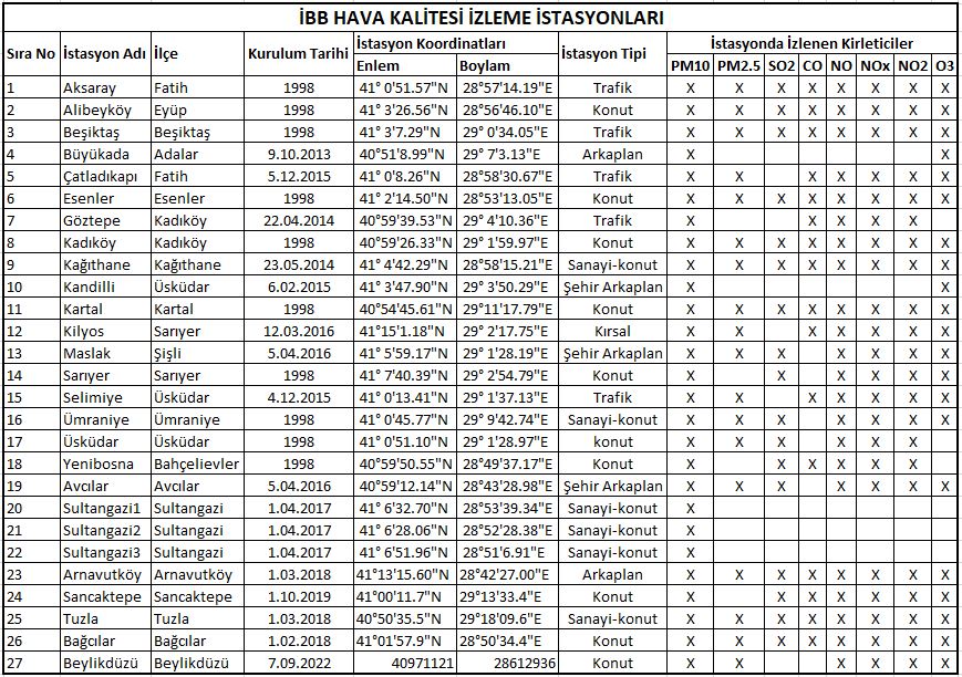 Mevcut hava kalitesi ağımız her yıl istasyon ağına yenilerini eklemektedir. 2023 yılı itibariyle İstanbul ’da 28 adet sabit ve 1 adet mobil hava kalitesi izleme istasyonu mevcut olup, tüm istasyonlarda tam otomatik cihazlarla ölçüm yapılmakta ve ölçüm sonuçları merkezden izlenmektedir. Tam otomatik cihazlarla elde edilen veriler on-line olarak İBB Çevre Koruma Müdürlüğü hava laboratuvarındaki merkez bilgisayar sistemine saatlik ortalamalar halinde gelmekte ve internet ortamında İstanbul halkının erişimine sunulmaktadır.