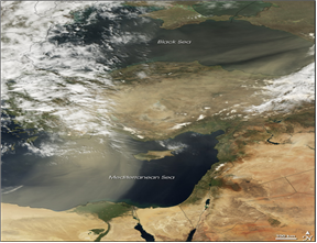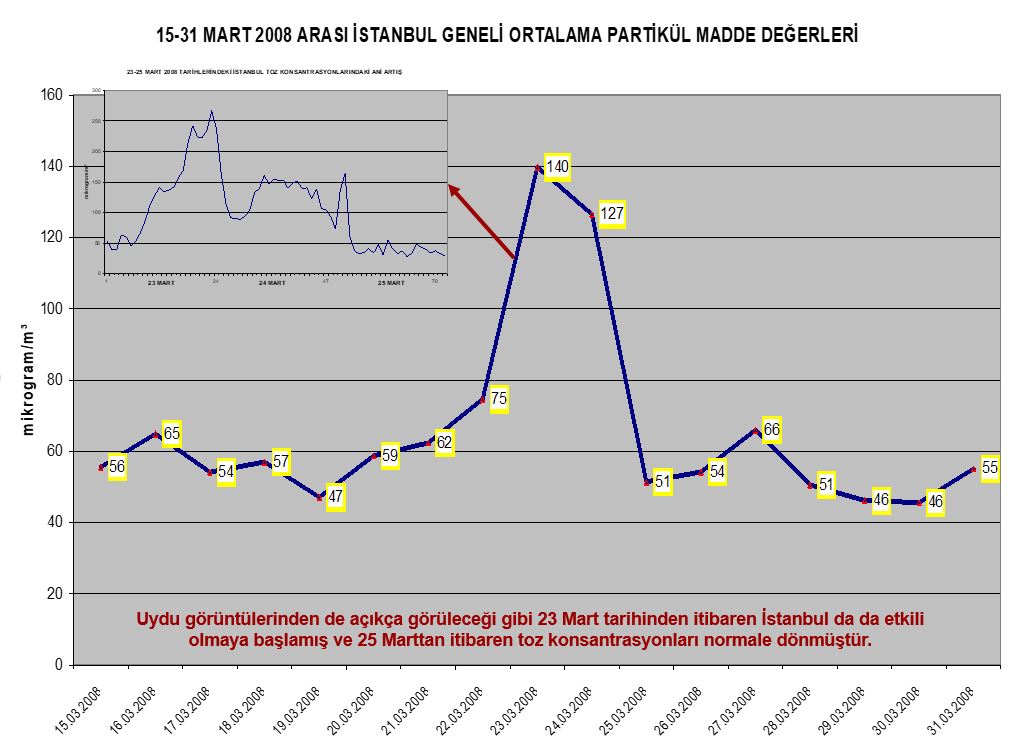 Ayrıca, İstanbul’un hava kirliliği değerlendirilirken, Asya-Afrika ve Avrupa’dan taşınan uzun mesafeli kirlilik de göz önünde bulundurulmalıdır. Yapılan bazı araştırmalar açıkça ortaya konmuştur ki, Türkiye’de nispeten yüksek yoğunluklu partikül madde oluşumları, kuzeybatı ve güney rüzgârlarıyla görülmektedir ki, bu da, özellikle Sahra çöl tozlarının ve Doğu Avrupa ülkelerinin etkisini işaret etmektedir. Aşağıda uydu görüntülerinden de açıkça görüleceği gibi Sahra çölünden Türkiye üzerine doğru gelen kum fırtınası İstanbul’da da etkili olmuş ve İstanbul partikül madde konsantrasyonlarında aşırı derecede artışlar gözlenmiştir.